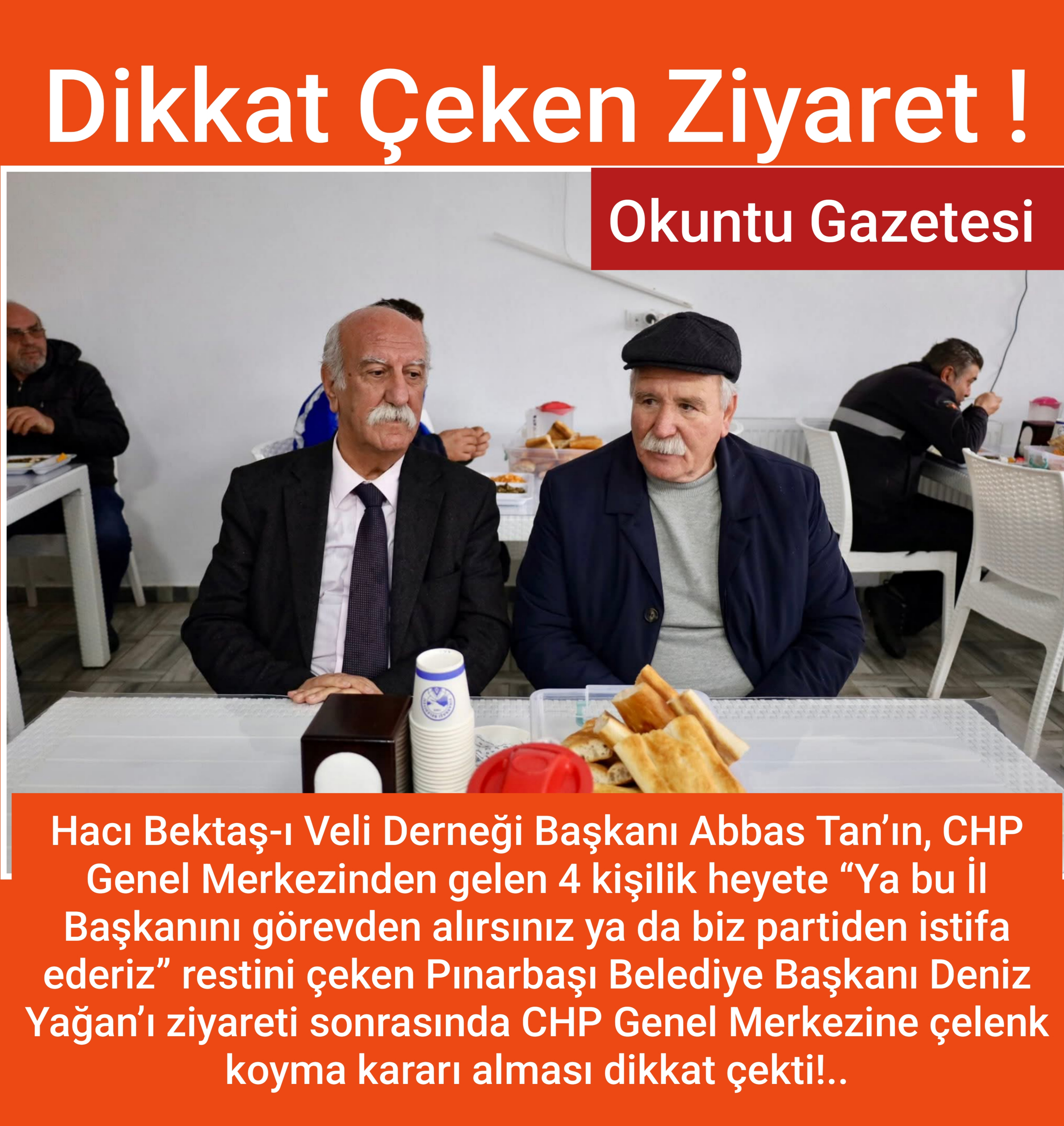 Hacı Bektaş-ı Veli Derneği Başkanı Abbas Tan’ın, CHP Genel Merkezinden gelen 4 kişilik heyete “Ya bu İl Başkanını görevden alırsınız ya da biz partiden istifa ederiz” restini çeken Pınarbaşı Belediye Başkanı Deniz Yağan’ı ziyareti sonrasında CHP Genel Merkezine çelenk koyma kararı alması dikkat çekti!..