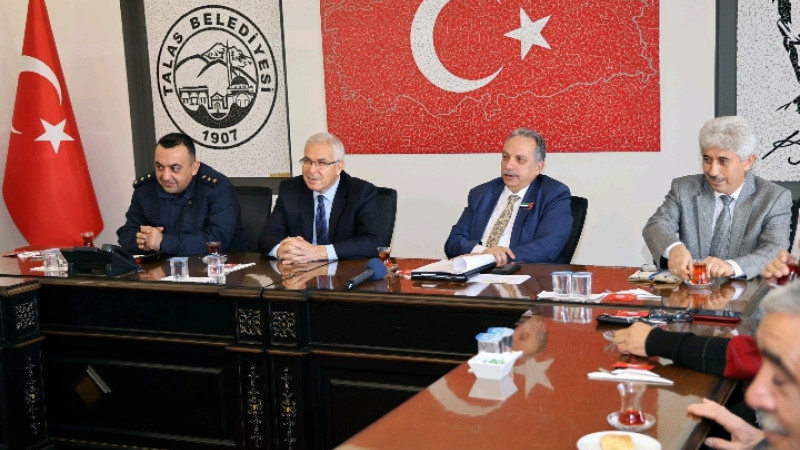 Talas Kaymakamı Yaşar Dönmez ve İlçe Jandarma Komutanı Yzb. Akın Poçulu’nun da katılımıyla Başkanlık Toplantı Salonu’nda düzenlenen toplantıda, muhtarların yakasında bulunan Filistin bayrağı dikkat çekti.